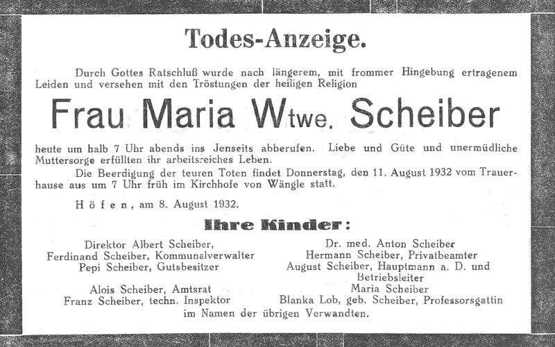 Höfen. Am Montag, den 8. August verschied hier die weit bekannte und geachtete Frau Maria Scheiber nach längerem Leiden. Sie war die Witwe des früheren Straßenmeisters und Besitzers des Gasthauses zur Krone in Höfen, namens Ferdinand Scheiber und galt als brave, treubesorgte Mutter, die 8 Söhnen und zwei Töchtern das Leben schenkte und ihnen eine gute Erziehung angedeihen ließ. Nun hat dieses treue Mutterherz aufgehört zu schlagen.