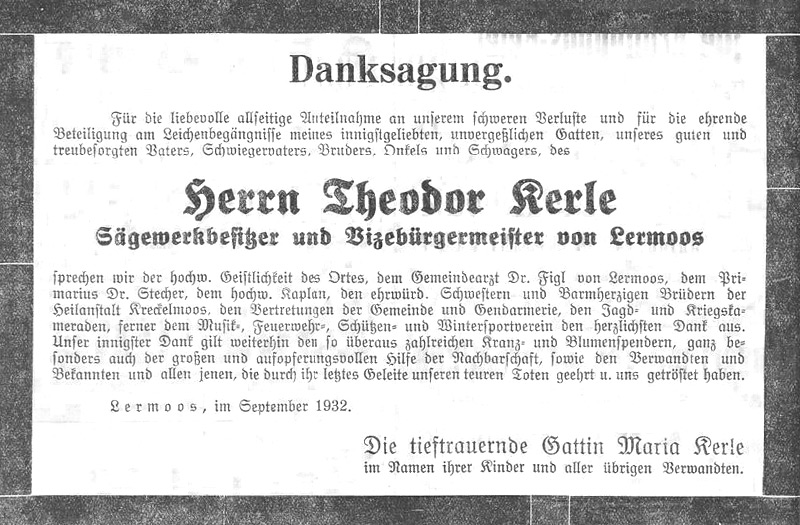 Lermoos. Ganz unerwartet verschied am 5. ds. 4 Uhr früh an einem schweren Magenleiden in der Heilanstalt Kreckelmoos der Sägewerksbesitzer und Vizebürgermeister von Lermoos Theodor Kerle. Der Verstorbene ist im Jahre 1874 in Rieden bei Ehenbichl geboren und entstammte einer angesehenen alten Familie. Um das Jahr 1900 kam er nach Lermoos und richtete dort das alte Sägewerk neu her. Einige Jahre später schloß er den Ehebund mit seiner heute noch lebenden Frau Maria, aus welcher Ehe 10 Kinder entsprossen von denen 2 Töchter und 6 Söhne noch am Leben sind. Theodor Kerle rückte im Jahre 1895 zum 4. Regiment der Tiroler Kaiserjäger zur aktiven Dienstleistung ein. Im Mai 1915 erwarb Kerle das Heimatsrecht in Lermoos. Nach dem Kriege war er ständig Mitglied des Gemeinderates und mehrmals Vizebürgermeister. Er wurde insbesondere als Vertreter der bäuerlichen Bevölkerung hoch geschätzt und seine Rechtlichkeit und Zähigkeit ist sprichwörtlich geworden. Die Gemeinde erleidet durch das Hinscheiden Kerles einen schweren Verlust. Gemeindearzt Dr. Figl von Lermoos hatte sofort nach seiner Zuziehung die richtige Diagnose gestellt und die augenblickliche Ueberführung in die Heilanstalt Kreckelmoos veranlaßt, es ist aber der Kunst der Aerzte nicht mehr gelungen, ihn zu retten. Todesursache war ein Magendurchbruch.