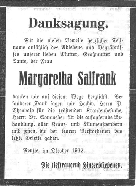 von 74 Jahren starb am Donnerstag früh Frau Margaretha Salfrank. Die Verstorbene war Mutter von 7 Kindern. 2 davon mußte sie dem Vaterlande opfern. Ihr Gatte verschied schon vor 35 Jahren zu einer Zeit, als ihr jüngstes Kind erst ein Jahr zählte. Mit Frau Salfrank ist eine gute, treubesorgte Mutter dahingegangen, deren höchstes Ziel es war, für ihre Lieben trotz der vielen Schicksalsschläge, nur das Beste zu erreichen. Frau Salfrank war eine geborene Bleier; ihre Mutter, welche im Jahre 1926 starb, erreichte ein Alter von 99 Jahren. Die Heimgegangene wird heute Samstag auf dem Friedhofe in Breitenwang begraben.