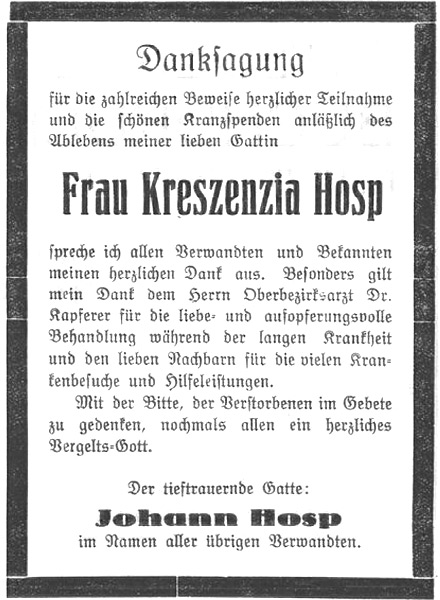 Aus: Außferner Bote vom 30. Nov. 1932 Frau Kreszenzia Hosp geb. Wagner † . Im Alter von 63 Jahren starb am Montag nach langem schwerem Leiden Frau Kreszenzia Hosp geb. Wagner. Die Verstorbene war eine arbeitsame, christliche Frau, deren Heimgang allgemein betrauert wird. An ihrer Bahre trauern der Gatte und Bruder.