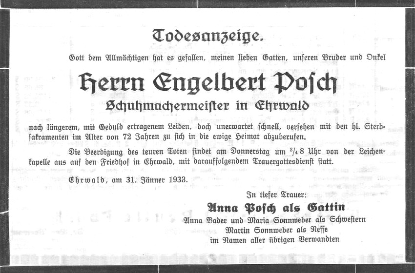 Aus: Außferner Bote vom 1. Feb. 1933 Ehrwald. Im Alter von 72 Jahren starb am Dienstag früh der Schuhmachermeister Engelbert Posch nach längerem Leiden. Der Verstorbene war Zeit seines Lebens ein arbeitsamer und fleißiger Mann und ein aufrechter Christ. Bis zu den letzten Tagen betrieb er sein Handwerk. Sein Heimgang wird allgemein betrauert.