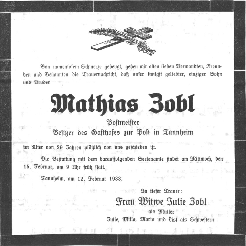 Matthias Zobl † . „Rasch tritt der Tod den Menschen an." Dieser Spruch bewahrheitete sich wieder. Mag einer auch im Frühling des Lebens stehen, der Sensenmann verschont ihn nicht. Eine tieferschütternde Trauerkunde durcheilte Sonntag, den 12. ds. in früher Morgenstunde unsere Pfarrgemeinde und das Tannheimer Tal. Postmeister Zobl, hieß es, habe sein junges Leben in die Hände des Schöpfers gelegt. Ganz plötzlich und unerwartet raffte der Tod ihn aus dem Familienkreise, den Hinterbliebenen einen unersetzlichen Verlust verursachend. Am Samstag abends wurde Zobl von Magenkrämpfen befallen. Nachdem er sich durch ein ärztliches Mittel Linderung verschafft hatte, begab er sich zur Ruhe, wobei er den Seinen gegenüber bemerkte, daß es ihm nun besser gehe. Die gleiche Versicherung gab er auch einer Schwester, die am Sonntag um 3 Uhr früh sich nach seinem Befinden erkundigte. Als ihn aber um 6 Uhr früh seine Mutter aufsuchte, mußte sie feststellen, daß ihr Sohn bereits in die Ewigkeit eingegangen war. Zobl stand erst im 29. Lebensjahre. Sein Tod brachte nicht nur über seine Mutter und seine 4 Schwestern schweres Leid und unsagbaren Schmerz, sondern erfüllte auch die ganze Gemeinde und alle, die ihn kannten mit großer Trauer. Der Verstorbene war ein Mann von edlem Sinn und liebevoller Wesensart, musterhaft wandelte er seinen Lebenspfad, getreu den Grundsätzen, die ihm als Kind seine Eltern in das Herz gelegt hatten. Nachdem er eine Handelsschule besucht hatte, war Zobl schon frühzeitig seinem Vater in der Leitung des Gasthausbetriebes behilflich, den er nach dessen vor ungefähr 2,5 Jahren erfolgten Tod dann selbst übernahm. Durch Fleiß, Freundlichkeit, Bescheidenheit und geschäftstüchtige Arbeit machte er den Gasthof zur Post zu einer bei Einheimischen und Fremden beliebtesten Gaststätte des Dorfes. Trotz der vielen Mühen seines Berufes fand er noch Zeit, im Verkehrsverein sich eifrig zu betätigen, wo er bis zur letzten Stunde auch die Stelle des Zahlmeisters mit aller Gewissenhaftigkeit versah. Durch Aufopferung und Fleiß hat er sich so manches Verdienst um den Verein erworben und den Fremdenverkehr in der Gemeinde Tannheim gefördert. Zobl, der überhaupt als Bahnbrecher für den Skisport im Tannheimer Tale gelten darf, war auch staatlich geprüfter Skilehrer. Seine Begeisterung für alles Gute und Schöne sowie sein echtes Christentum brachten es auch mit sich, daß er schon seit seinen Schuljahren dem Kirchenchor und dem Orchester ein eifriges Mitglied war. Seinen Grundsatz, der lautete: „Gerechtes Handeln", führte er unterschiedslos durch. So konnte er sich allgemeiner Beliebtheit erfreuen, besonders deshalb, weil er auch ein Freund und Gönner der Armen war. Möge dieser uns allen teure Freund im Himmel droben den gebührenden Lohn für alle guten Werke empfangen, die er auf seiner kurzen Pilgerfahrt auf Erden vollbracht hat!
