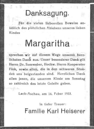 Aus: Außferner Bote vom 15. Feb. 1933 Wängle. Am vergangenen Sonntag wurde hier das 5 Jahre alte Mädchen Margarethe Heiserer, Töchterchen des Postoberoffizials Heiserer in Reutte und früheren Postmeisters in Lermoos, zu Grabe getragen. Das Kind war am Freitag abends an einer Herzlähmung nach kurzer Krankheit von Gott in die Ewigkeit abberufen worden.