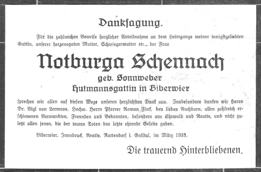 Biberwier. Vergangenen Mittwoch wurde unter zahlreicher Beteiligung auf dem hiesigen Friedhof die sterbliche Hülle der ehrengeachteten Frau Notburga Schennach geb. Sonnweber zur ewigen Ruhe bestattet. Die Verstorbene, eine treubesorgte Mutter und Gattin, stand im 81. Lebensjahre und stammte aus Ehrwald. An ihrem Grabe trauern der Gatte und 4 erwachsene Kinder, von denen ein Sohn Post-Oberoffizal in Reutte ist.