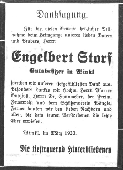 Aus: Außferner Bote vom 25. März 1933 Wängle. In Winkl starb der 63jährige Gutsbesitzer Engelbert Storf. Der Verstorbene hinterläßt 3 erwachsene Kinder. Seine Gattin ging ihm vor einem Jahre im Tode voraus. Storf war 24 Jahre lang in München als Maurer tätig, den Weltkrieg machte er bei den Standschützen mit.
