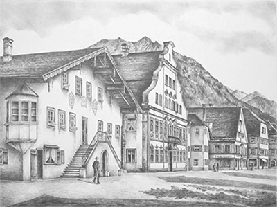 "...gern weilt man vor den Häusern, wo Joseph II. übernachtete, und Pius VI. den Segen gab, und ruft sich jene Zeiten zurück. Eine Fischbeinfabrik wird der Gewerbige nicht unbeachtet lassen. Für die leidende Menschheit ist hier durch ein kleines Spital gesorgt. In der zweiten Hälfte des verflossenen Jahrhunderts war das k.k. Kreisamt Oberinnthal hier; jetzt befindet sich das k.k. Land- und Kriminal-Untersuchungsgericht Ehrenberg, ein Salinenwald- und Mautoberamt und die Post, dann ein ammannischer Stiftsarzt und der bürgerliche Marktmagistrat..."