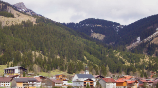 der Ort Nesselwängle mit der Schneid und der bewaldeten Erhebung der Dietzl - rechts davon das Tiefjoch; (Aufnahme von 2003)