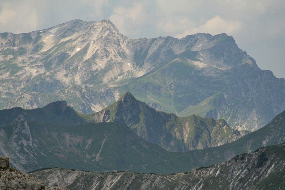 Blick auf den Älpelekopf von Osten (Leilachspitze) - im Hintergrund das Daumen-Massiv