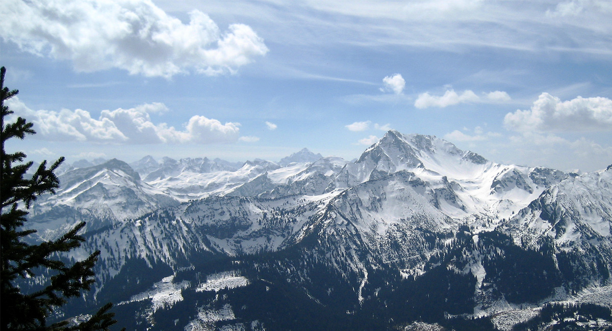 Ausblick vom Aufstieg zum Einstein auf die gegenüberliegenden Vilsalpseeberge mit Geißhorn und dem mächtigen Hochvogel im Hintergrund