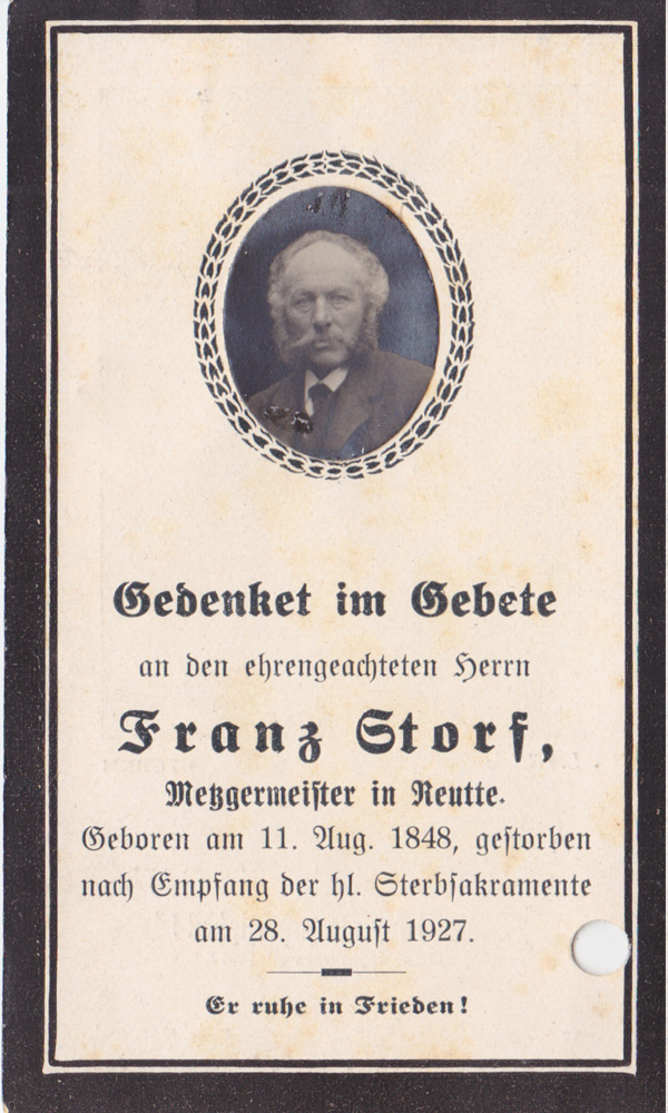 Reutte. (Beerdigung). Am vergangenen Dienstag wurde ein alter Bürger von Reutte, weitum geschätzt und geachtet als Mensch und Geschäftsmann, im Friedhofe zu Breitenwang zur letzten Ruhe der geweihten Erde übergeben. Im ganzen Bezirk und darüber hinaus war er bekannt, der Metzgermeister und Selcher Franz Storf, unter dem Vulgärnamen "Gori". Der Verblichene stand im 80. Lebensjahre, hat sich aus kleinen Anfängen durch Fleiß, Umsicht und reelle Geschäftsführung zur angesehenen Geschäftsstellung emporgearbeitet im Vereine mit seiner braven Gattin und Familienmutter, die ihm ein Dutzend starke Kinder schenkte, wovon 8 noch am Leben sind, darunter ein Sohn, Tierarzt in St. Johann in Tirol, einer Beamter des Elektrizitätswerkes Reutte, zwei Söhne üben in Reutte den Beruf des Vaters aus, eine Tochter ist mit dem Brauerei- und Gasthofbesitzer Beck, eine mit dem Architekten und Baugeschäftinhaber Kerle, beide in Reutte, und eine auf dem bekannten Gasthof "zur Lände", verheiratet. Der älteste Sohn starb im Weltkriege als Kaiserjägerzugsführer nach erhaltener schwerer Verwundung in einem Spitale in Krakau. Die sorgenden Eltern hinterlassen die Kinder in geordneten Verhältnissen. Der Verblichene war eine Frohnatur, wie sie im Buche steht, ein kerniger Tiroler und in seinen Burschen- und Mannesjahren bekannt auch wegen seiner Kraft, Schneid und Behendigkeit. Der Tod seines ältesten Sohnes ging ihm nahe. Durch einen Unfall erhielt diese starke Eiche einen Stoß und verfiel sie einem langsamen Absterben. Seine stille, treue Gattin und die Kinder pflegten ihn und verschönten ihm die letzten Lebensjahre. Mit ihm ist ein Stück Alt-Reutte von hinnen geschieden. Die Bestattnis gestaltete sich zu einer eindrucksvollen Trauerkundgebung. Daran nahmen außer der Bürgerschaft, Vertretungen der Beamtenschaft, der Gendarmerie- und Finanzbeamtenschaft und der Geschäftswelt auch zahlreiche Trauergäste von auswärts, die Bürgermusik, Feuerwehr- und Kriegerverein mit Fahnen teil. Es war rührend zu sehen, wie seine Söhne, Töchter und Enkel, ein kraftvoller Nachwuchs in tiefer Trauer am Grab ihres Vaters standen, der ihnen im Leben so vieles tat und für sie sorgte wie selten einer. Er war aber auch ein Vater der Armen und gab im Stillen viel und an Bedürftige.