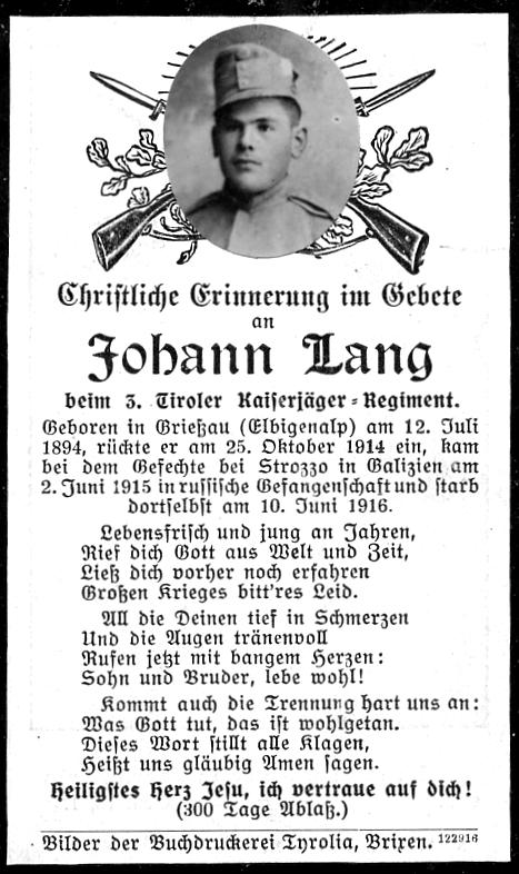 Dunajec mit, von dorten in die Karpathen, wo er am ganzen Winterfeldzug teilnahm, gerieht in der Schlacht bei Strozza in russische Gefangenschaft. Als gelernter Tischler wurde derselbe in der Gefangenschaft als Tischler in einer Tischlerei verwendet. Laut Mitteilung eines Mitgefangenen Kameraden geriet Lang am Abende des 10. Juni l. Jahres nach Feierabend beim Abwaschen in unaufgeklärter Weise, in den an der Tischlerei vorbeifließenden Fluß und ertrank. Die Sterbegottesdienste wurden in der Pfarrkirche in Elbigenalp am 29. Juli 1916 abgehalten, an demselben beteiligte sich sehr viel Militär und Standschützen mit Fahne, ebenso erschienen mit der Fahne die Veteranen und Urlauber von Bach und Holzgau trotz den strengen Bergheuarbeiten. Vater und der jüngste Bruder desselben stehen seit Mai 1915 bei den Standschützen im Felde; ein zweiter Bruder mit 19 Jahren bei den Tiroler Kaiserjägern gegen unsern Erzfeind Italien, wo derselbe verwundet wurde und durch sein tapferes Verhalten mit der silbernen