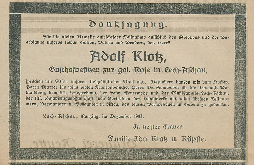 Lech-Aschau, 20. Dez. Nach schwerem Halsleiden verschied heute Herr Adolf Klotz, Gastwirt und Kaufmann hier. Der Verstorbene stand im 36. Lebensjahre und erfreute sich bei seinen Mitbürgern großer Beliebtheit. Er