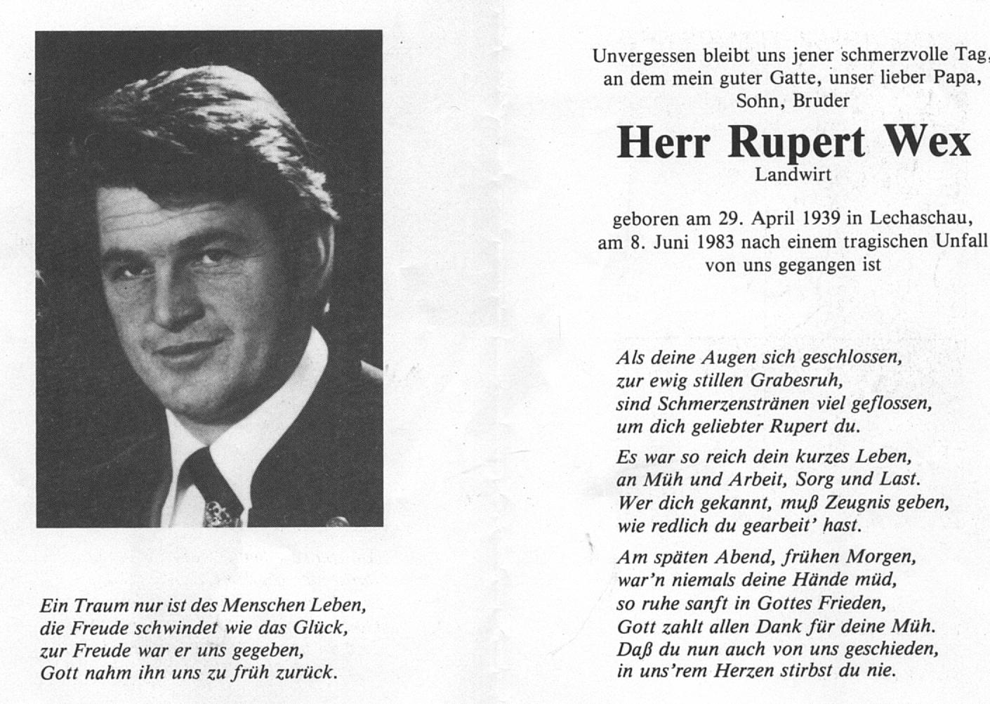 Beim Befahren eines Hanges kippte der Traktor um und blieb mit den Rädern nach oben liegen. Wex kam unter dem Traktor zu liegen und wurde von diesem erdrückt, da keine Überrollbügel und keine Sicherheitskabine vorhanden war.
