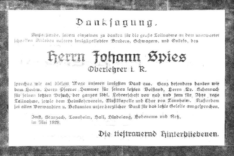Tannheim. Wie bereits berichtet, ist am 18. Mai Johann Spies, Oberlehrer i. R., nach Besuch der hl. Messe plötzlich an Herzschlag verschieden. Er war am 4. August 1857 in Stanzach (Lechtal) geboren, wurde Lehrer und wirkte an den Schulen in Tannheim, Vils und in Riegersburg (Niederösterreich), wo er in Pension ging. Er übersiedelte nach Retz, wo er sich ein Haus erwarb und nachdem dort seine Frau und Tochter gestorben waren, zog er nach Tannheim und lebte hier ruhig, bescheiden und zurückgezogen. Er war Ehrenbürger in Riegersburg.