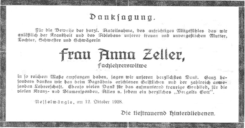 Nesselwängle. Am Mittwoch in der früh verschied nach einer langwierigen Krankheit Frau Anna Zeller, die Gattin des ihr vor Jahren im Tode vorausgegangenen Reuttener Bürgerschullehrers Lorenz Zeller. Die Verstorbene verbrachte ihre Witwenzeit in ihrer Heimat und betrieb die letzten Jahre eine Sommer-Wirtschaft in Haller. Sie war eine Tochter des hiesigen Kreuzwirtes und hinterläßt als Doppelwaise ein sechsjähriges Kind.