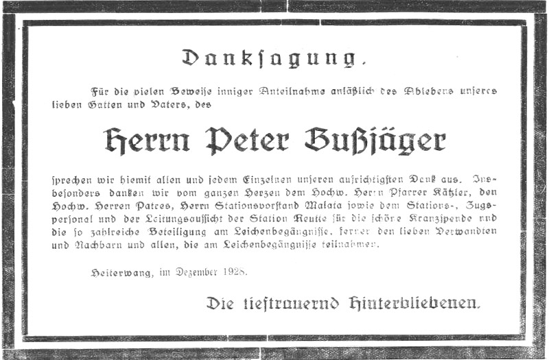 Heiterwang. Am vergangenen Dienstag hatte der Todesengel in unserer Gemeinde ein Opfer gefordert. Es war dies der im Alter von 77 Jahren stehende Oekonomiebesitzer Peter Bußjäger, welcher nach 14 monatlichem Leiden von Gott, dem Herrn in die Ewigkeit abberufen wurde. An der Bahre des Verstorbenen, der sich allgemeiner Wertschätzung erfreute, trauerten drei erwachsene Kinder. Die Beerdigung fand am Donnerstag unter großer Beteiligung der Bevölkerung statt. Der Dahingegangene ist der Vater des hiesigen Bahnbeamten Josef Bußjäger in Reutte. Ein Sohn des Verstorbenen gilt seit dem Weltkriege als vermißt.