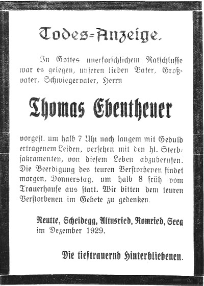 Thomas Ebentheuer † . Nach schwerem Leiden verschied am Dienstag früh im Alter von 79 Jahren der Zimmermeister Thomas Ebentheuer. Der Verstorbene, gebürtig aus Romried [Ronried] bei Markt-Oberdorf, kam in