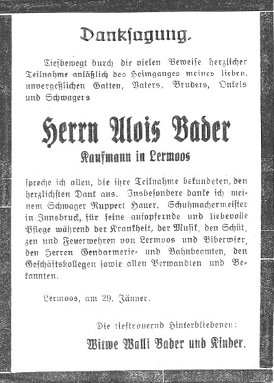 Lermoos. Hier starb vor einigen Tagen der Schuhmachermeister Alois Bader im Alter von 47 Jahren. Der Vater des Verstorbenen war ein alter Veteran der im Jahre 1864 den Krieg gegen Dänemark und die Schlacht bei den Düppeler Schanzen mitgemacht hatte. Unmittelbar vor Kriegsausbruch übernahm der junge Bader das Anwesen und das Geschäft seines Vaters. Im Jahre 1915 folgte er dem Rufe des Vaterlandes und rückte zum Standschützenbataillon Reutte ein, in dessen Reihen er den Weltkrieg bis zum Ende mitmachte. Im Felde holte er sich ein schweres Ohrenleiden, das zu seinem frühen Ableben sehr viel beitrug. Er hinterläßt eine Witwe und mehrere Kinder. Einer seiner nächsten Verwandten ist der bekannte P. Meinrad Bader, Subprior im Zisterzienserkloster zu Stams der gegenwärtig an einer Krankheit schwer darniederliegt. Am Begräbnis des Dahingegangenen nahmen außer seinen Verwandten und Bekannten auch die Bürgermusik und die Schützen von Lermoos, die Feuerwehren von Lermoos und Biberwier, die Gendarmerie- und Bahnbeamten und die Geschäftsleute teil.