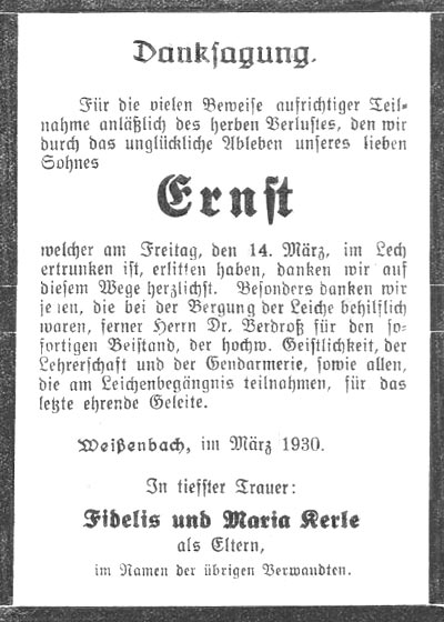 Weißenbach. Das 6 Jahre alte Kind, Ernst Kerle, einziges Söhnchen des Fidelis und der Maria Kerle in Weißenbach, ging am Freitag, den 14. März, gegen 4 Uhr nachmittag vom Beichtunterrichte heim. Bei dem sogenannten Riedener Steeg setzte es sich auf das schon schadhafte Brückengeländer, hutschte [schaukelte] sich ein bißchen, fiel hinunter in den Lech und ertrank. Ein ebenfalls 6jähriges Mädchen war bei ihm und dieses lief anstatt nach Weißenbach, nach Rieden um Hilfe zu holen. Das Kind konnte leider nicht mehr gerettet werden. Den schwergeprüften Eltern wird allgemeines Beileid kundgetan. Seit 21. April 1929, also fast ein ganzes Jahr lang, ist kein Todesfall mehr in Weißenbach zu verzeichnen.