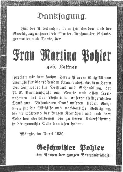 Wängle. Am 4. ds. schloß sich hier das Grab über die Witwe Frau Martina Pohler geb. Leitner von Winkl, welche im 86. Lebensjahre stehend, nach kurzer Krankheit ein arbeitsreiches Leben, das aber auch reich war an Sorgen und Mühen, beschloß. Mit ihr ist eine Mutter in des Wortes wahrster Bedeutung zur ewigen Ruhe eingegangen, eine Erzieherin von Gottes Gnaden, deren Früchte an ihren erwachsenen Kindern sichtbar sind, die ihr Stolz, ihre Freude und ihre Sorge bis zum Tode waren. Sie hat sie zu tüchtigen Menschen erzogen, deren bescheidenes Wesen und gute Art in der heutigen Zeit der Ueberhebung so wohltuend von der Masse absticht. In Arbeit und Gebet, in der unentwegten Sorge für die Familie ist sie den langen dornenreichen Weg des Ehe- und Witwenstandes durchgegangen, erfüllt von Gottesvertrauen und nie versagendem Opfermut. Der Friede war im Hause und auf strengsten Frieden mit der Nachbarschaft hielt sie alles. Die stille Frau tat dem Nebenmenschen nur Gutes, in Wort und Werk; die Linke wußte nicht, was die Rechte tat. Sieben Kinder blieben am Leben. Ein Sohn fiel in Galizien, ein anderer Sohn und eine Tochter sind in Lech-Aschau verheiratet, der dritte Sohn ist Kanzleibeamter beim Vermessungsamte in Reutte, der vierte in Winkl verheiratet. Ihr Mann, ein ebenfalls braver und rechtschaffener Charakter, ist ihr schon lange im Tode vorausgegangen. Der größte Schmerz wird wohl für ihr Mutterherz gewesen sein, als eine glücklich verheiratete Tochter und kurz darauf deren Mann ins frühe Grab sank. Die Sorge galt nun auch ihren Enkelkindern aus dieser Ehe, die sie dann mit Liebe umgaben und betreuen halfen. Eine zweite erwachsene Tochter, die ledig geblieben, starb vor Jahresfrist. Nun ruhe aus Du edles Mutterherz, von all den Erdensorgen! Der Herr wird Dein Vergelter sein.