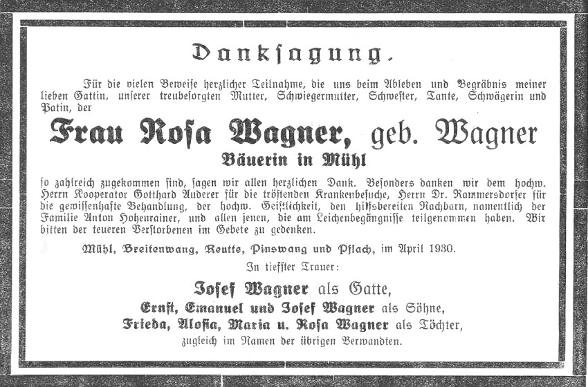 Mühl. Ein langer Leichenzug bewegte sich zum Breitenwanger Friedhofe. Frau Rosa Wagner, genannt Welschrosa war es, die man in das kühle Grab senkte. Eine Lungenentzündung hatte sie auf das Krankenlager geworfen und ihr im Alter von 53 Jahren das Leben genommen. Sie war nicht nur ihren sieben Kindern, deren jüngstes noch in die Schule geht, eine gute, treubesorgte Mutter, sondern erfreute sich auch wegen ihres freundlichen und leutseligen Wesens und ihres guten, gesunden Humors weitum größter Beliebtheit.