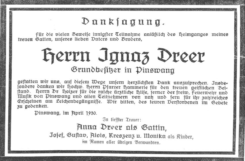 Pinswang. Der 48 jährige Landwirt Ignaz Dreer führte den in seiner Pflege befindlichen Zuchtstier am Dienstag aus dem Stalle, damit sich das Tier, welches er am Mittwoch zur Ausstellung nach Lech-Aschau bringen wollte, an das Freie gewöhne. Sobald der Stier den Stall verlassen hatte, wandte er sich gegen Dreer spießte ihn mit den Hörnern auf und drückte ihn an einen Baum, so daß Dreer bewußtlos zusammenbrach. Der aus Füssen herbeigerufene Arzt Dr. Holzer stellte todbringende Verletzungen fest, denen Dreer am Mittwoch halb 2 Uhr früh erlag. Der Verstorbene wurde am Donnerstag unter zahlreicher Beteiligung beerdigt.
