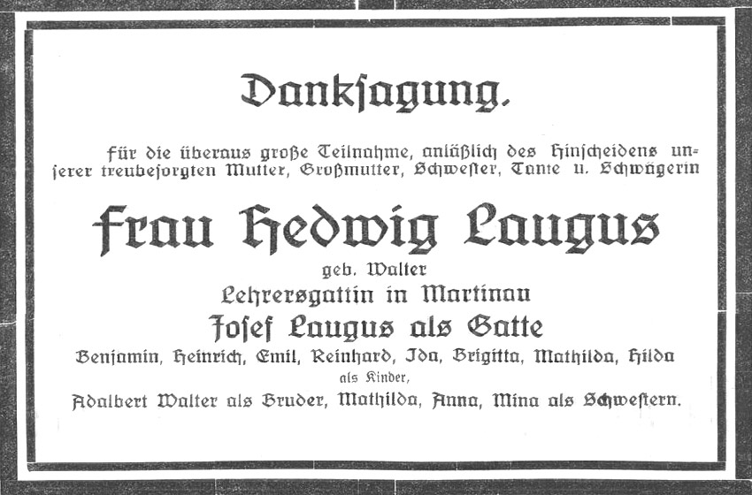 Elmen. Am Freitag verschied im Krankenhause zu Kreckelmoos Frau Hedwig Laugus geb. Walter, Lehrersgattin in Martinau, im Alter von 57 Jahren an einem langwierigen schweren Krebsleiden. Die Leiche wurde in die Heimat überführt und am Sonntag unter großer Beteiligung aus nah und fern zur