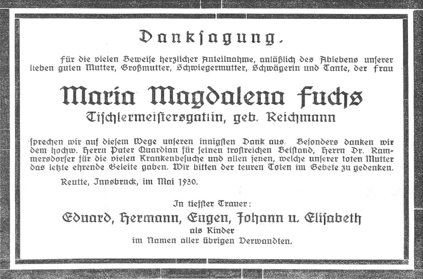 Witwe Maria Magdalena Fuchs † . Am Sonntag um 6 Uhr abends starb nach kurzem Leiden, zweimal versehen mit den Tröstungen der hl. Religion, die Hausbesitzerin Frau Maria Magdalena Fuchs geb. Reichmann. Die Heimgegangene, welche im 75. Lebensjahre stand, war die Gattin des schon im Jahre 1918 verstorbenen Tischlermeisters Fuchs. Sie erfreute sich bis in ihr hohes Alter hinein stets der besten Gesundheit und hatte erst kurz vor ihrem Tode eines Arztes bedurft. Als arbeitssame und christliche Frau genoß sie hier große Achtung und Beliebtheit. Sie hinterläßt fünf erwachsene Kinder, die alle verheiratet sind, und mehrere Enkelkinder. Ihre sterbliche Hülle wurde gestern früh unter großer Beteiligung auf dem Friedhofe zu Breitenwang ins Grab gesenkt.