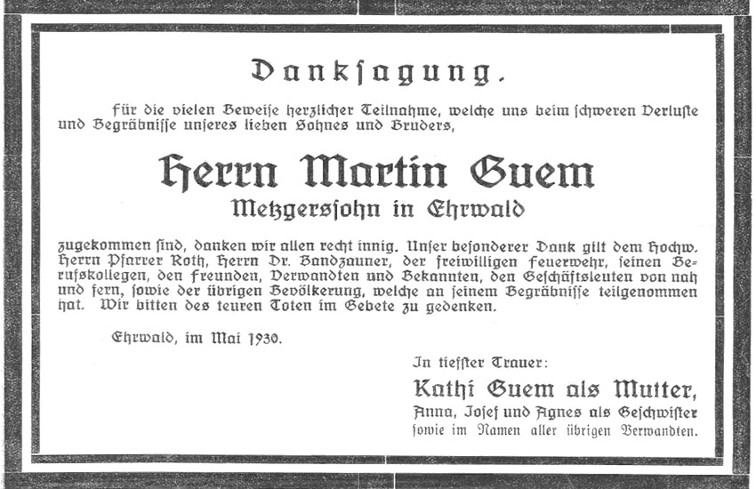 Ehrwald. Am 20. Mai schloß sich hier das Grab über den 22jährigen Metzgerssohn Martin Guem. Eine Lungenentzündung hatte dem jungen Leben ein jähes Ende bereitet. Guem erhielt ein sehr schönes Leichenbegängnis. Auch die Feuerwehr gab dem jungen Mitgliede das letzte Geleite. Die Leidtragenden füllten das