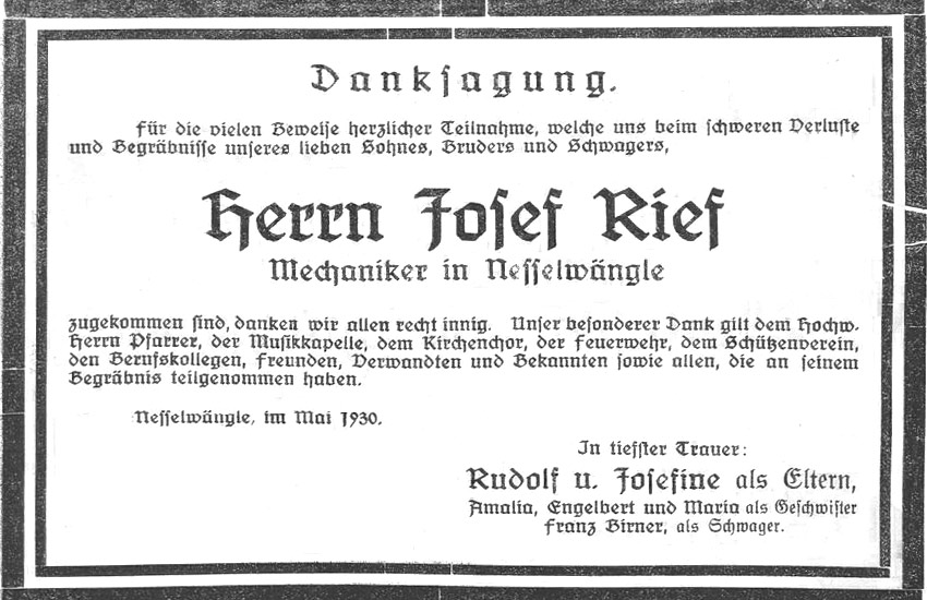 Nesselwängle. Gestern früh wurde der Mechaniker Josef Rief, Sohn des Rudolf Rief, der hier eine Gemischtwaren- und Holzhandlung führt, unter zahlreicher Beteiligung zu Grabe getragen. Ein furchtbares Motorradunglück machte dem blühenden Leben des 26jähr. braven Burschen ein jähes Ende. Am letzten Sonntag auf der Fahrt von Landeck nach Pians, von wo er angeblich einen Kameraden abholen wollte, scheint der Verblichene aus einer uns Lebenden unbekannten Ursache die Herrschaft über das Fahrzeug verloren zu haben. Die kurvenreiche Spur an der Unfallstelle läßt nichts Bestimmtes schließen. Schulkinder von Pians sollen in einiger Entfernung Zeugen des Unglücks gewesen sein. Mit klaffenden Wunden am Hinterhaupte wurde er tot von den Einheimischen an der Unglücksstelle angetroffen. Rief galt als tüchtiger und erprobter Fahrer. Die Musikkapelle, der Kirchenchor, die Schützen und die freiwillige Feuerwehr, deren Mitglied er war, gaben ihm das letzte Ehrengeleite.