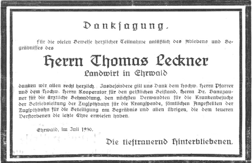 Ehrwald. Am Samstag abends starb der 71jähr. Landwirt Thomas Leckner. Der Allmächtige hatte ihn