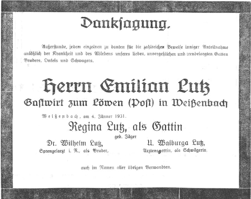 Weißenbach. Im Krankenhause zu Kreckelmoos verschied am 31. Dezember morgens halb 5 Uhr nach äußerst schmerzhafter Krankheit, infolge eingetretener Herzlähmung der Postgasthofbesitzer zum Löwen Emilian Lutz im Alter von 63 Jahren. Der Verstorbene, ein ehrenhafter Charakter und pünktlich genauer Geschäftsmann, war ein Bruder des pensionierten Sprengelarztes Dr. Lutz in Weißenbach und ein Tiroler von altem Schrott und Korn. Sein Hinscheiden wird allseits Bedauert. Er hinterläßt seine Gattin, sein Sohn ging ihm vor mehreren Jahren im Tode voraus.