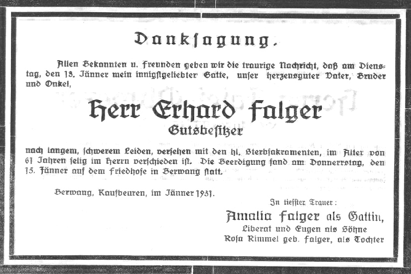 Berwang. Im Alter von 61 Jahren starb hier der Gutsbesitzer Erhard Falger. Der Verstorbene rückte mit den Standschützen im Jahre 1915 ein und verbrachte über zwei Jahre im Felde. Dort holte er sich auch den Keim für ein schweres Leberleiden, von welchem er nie mehr genesen konnte. Im vergangenen Monat wollte er noch Heilung im Kreckelmoos suchen, doch war dies nicht mehr möglich. Mit Falger ist ein christlicher, arbeitsamer Bürger unserer Gemeinde dahingegangen, dessen höchstes Ziel es war, für das Wohl seiner Lieben zu sorgen. Um ihn trauern die Gattin und drei erwachsene Kinder.