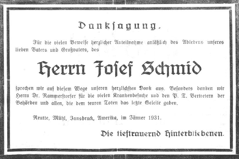 Josef Schmid † . Am Dienstag, den 20. ds. verschied in Reutte einer der ältesten Bürger unseres Marktes, Herr Josef Schmid. Der Verstorbene war am 1. November 1849 geboren und verehelichte sich im November 1869 mit der Bürgerstochter Anna Lechner. Im Jahre 1871 erwarb er zusammen mit seiner Frau das damalige Gasthaus "zum roten Ochsen" in Reutte von den Eheleuten Adolf Knittel und Elisabeth geb. Wind, welche Gastwirtschaft er bis zum Jahre 1887 innehatte. Im Jahre 1887 verkaufte er das Gastwirtsanwesen an die Metzgermeisters- und Gastwirtseheleute Franz und Josefa Storf geb. Reinstadler und wurde dann als Gemeindediener — damals gab es in Reutte noch keine Polizei — angestellt, welchen Posten er durch mehr als zwei Jahrzehnte zur vollsten Zufriedenheit seiner Vorgesetzten ausfüllte. Dank der Unterstützung, die ihm seine Kinder, insbesondere die in Amerika weilenden zwei Töchter, angedeihen ließen, konnte Schmid in seinen alten Tagen sich Ruhe und ein sorgenfreies Leben gönnen. Am Donnerstag, den 22. ds. wurde die irdische Hülle des Verstorbenen im Friedhofe zu Breitenwang beerdigt. Zahlreiche Verwandte und Bekannte aus Reutte und Umgebung geleiteten ihn vom Leichenhause aus zur letzten Ruhestätte. An seinem Grabe trauern 6 erwachsene, wohlversorgte Kinder. Er ruhe in Frieden!