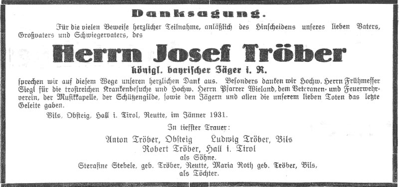 Vils. Am Samstag um 10 Uhr nachts starb hier der 82jährige Josef Tröber, kgl. bayerischer Oberjäger i. R., nach längerem Leiden. Mit ihm verliert der Veteranenverein Vils seinen Gründer und die Stadt einen angesehenen Bürger. Tröber war zur Zeit, als der bayerische Prinz Ludwig, der spätere König Ludwig III., die hiesigen Jagden in Pacht hatte, durch viele Jahre hindurch Oberjäger. Er machte auch die Okkupation der Herzogowina mit. Gestern wurde der Verstorbene unter großer Teilnahme der Bevölkerung und der Jägerschaft auf dem hiesigen Friedhofe beerdigt. Wie er seinerzeit seinem königlichen Jagdherrn, und anderen Jagdgästen so manchen grünen Bruch gereicht, so wurde auch ihm, dem treuen Jäger, ein grüner Bruch ins kühle Grab gesenkt.