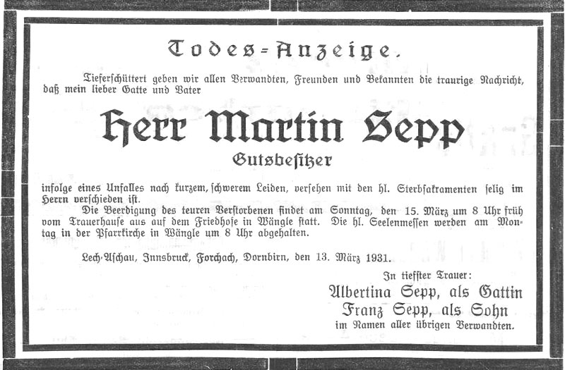 abgetrennt werden mußte. Gestern früh ist der Bedauernswerte infolge der inneren Verletzungen und Herzschwäche in Gott verschieden. Mit Martin Sepp