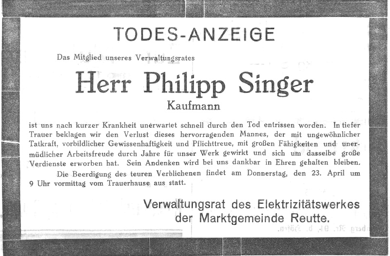 Vom Giebel des Magistrates weht die Trauerfahne. Unser 2. Vizebürgermeister, Gemeindeverwalter i. P. Philipp Singer ist in der Nacht von Montag auf Dienstag für immer von uns gegangen. Der Verstorbene, eine im ganzen Bezirk bekannte Persönlichkeit, war am 1. Mai 1866 geboren und stand somit im 65. Lebensjahre. Nach Vollendung seiner Schulzeit erlernte er in Innsbruck das Buchbinder- und Glasergewerbe und durchwanderte nach seiner Lehrzeit einen Großteil Oesterreichs, Deutschlands und der Schweiz als Geselle. Nach Reutte zurückgekehrt, übte er zunächst das Glasergewerbe aus. Da diese Beschäftigung allein nicht seine ganze Zeit auszufüllen vermochte, entschloß sich der arbeitsfreudige Mann, bei dem damaligen Notar Eduard Poley eine Stelle als Kanzlist anzunehmen, umsomehr, als das elterliche Porzellanwarengeschäft damals seine noch rüstige Mutter führte, welche ihm erst vor einigen Jahren im Tode vorausging. Nach dem Ableben des Gemeindesekretärs Lagg, dem Vater des langjährigen Schulleiters Thomas Lagg in Reutte, erhielt der Verstorbene unter Altbürgermeister Bauer im Jänner 1905 den Posten als Sekretär der Marktgemeinde Reutte. Mit Liebe und Hingebung waltete er seines Amtes. Als großer Naturfreund nützte er seine freien Stunden dazu aus, um die Markungen der Gemeinde auf das genaueste kennen zu lernen und mit Recht sagte man bei Grenzangelegenheiten: "Fraget den Philipp!" Schwere Zeiten hatte Singer im Kriege mitzumachen. Unter Bürgermeister Müller wurde ihm die Versorgung der Reuttener Bevölkerung mit Lebensmitteln übertragen. Trotz der vielen Unanehmlichkeiten, welche diese Arbeiten mit sich brachten, verlor er den Mut nicht und war, wenn die Frauen mit noch so "kriegerischer" Miene angerückt kamen, nie verlegen. Er verstand es immer wieder, sie zu beruhigen. Seine damaligen Mitarbeiter, besonders Frau Witwe Huter, welche mit anhören mußten was man dem Philipp alles sagte, konnten seine eiserne Geduld nicht genug bewundern. Diese Zeiten sind nun Gottlob längst vorbei. Eines bleibt unvergeßlich, wenn die Not noch so groß war, gerecht ist es
