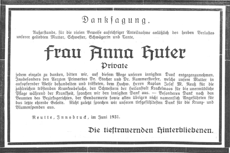 Todesfall. Im Alter von 64 Jahren verschied in der Heilanstalt Kreckelmoos nach 14tägiger Krankheit Frau Anna Huter. Mit ihr schied die älteste Tochter der alten Huterfamilie von der Katzenmühle aus dem Leben. Die Verstorbene wurde auf dem Friedhofe in Breitenwang beigesetzt. An ihrem Leichenbegängnis beteiligten sich unter zahlreichen Trauergästen auch Beamte der Gendarmerie und des Bezirksgerichtes.