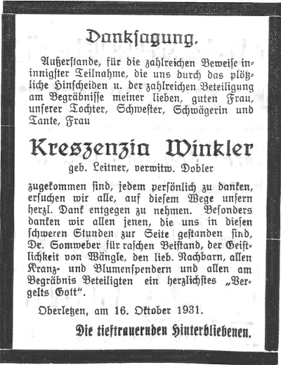 Oberletzen. Gestern vormittag verschied eines plötzlichen Todes die in den Fünfzigerjahren stehende Frau Zenzi Winkler aus Oberletzen, als sie von dort mit dem Rade nach Lech-Aschau fahren wollte. Unterwegs begegnete sie ihrem Manne, der eben von seiner Arbeit in Lech-Aschau zurückkehrte. Kaum war Frau Winkler vom Rade abgestiegen, wurde ihr übel und mit den Worten: „Mir ist schlecht!" stürzte sie zu Boden und war auf der Stelle tot. Die Verstorbene hinterläßt keine Kinder.