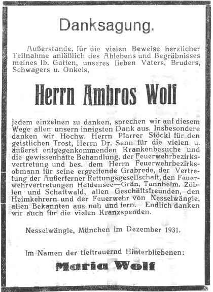 ds. aus dem Kreise seiner Lieben. Mit ihm scheidet ein charaktervoller, fleißiger, pflichteifriger Mann und treubesorgter Familienvater aus unserer Mitte. Groß ist die Lücke, die er in der Gemeinde zurückgelassen hat. Schwer vermissen ihn die Nachbarn, denen er immer in freudiger Hilfsbereitschaft zur Verfügung stand und für die er jederzeit ein frohes Wort hatte. Unersetzlich ist der Verlust für seine Gattin und seine 4 Kinder im Alter von 11 Monaten bis 8 Jahren. Wohl jedermann fühlt diesen Schmerz der Frau mit, die dazu noch selbst schwer leidend darniederliegt. Vor etwa 3 Wochen brachte sie das Sanitätsauto in die Heilanstalt Kreckelmoos und nach kaum 10 Tagen begonnener Genesung wurde sie wieder heimgeführt an das Sterbelager ihres Gatten, wo Verwandte schweren Herzens und voller Sorge ihre Pflicht erfüllten. Die Freiwillige Feuerwehr Nesselwängle verlor in Ambros Wolf ihren tüchtigen Kommandanten, der Feuerwehrbezirksverband Reutte seinen braven Mitarbeiter und die Außerferner Rettungsgesellschaft ihren jederzeit hilfsbereiten Leiter des Samariterpostens. Gott gebe dem Heimgegangenen ewige Ruhe und Frieden, seiner Gattin aber bald volle Gesundheit und frohes Kinderlachen möge ihr auch diesen schweren Verlust leichter verschmerzen lassen.