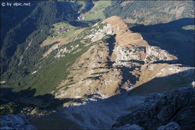 Diesen umgeht man rechts und gelangt auf die Gratschneide (Drahtseilsicherungen), welche man bis zum nächsten Grataufschwung verfolgt. Über schrofiges Gelände links des Grates bergauf und bis hin zu dem Wegweiser, welcher den vom