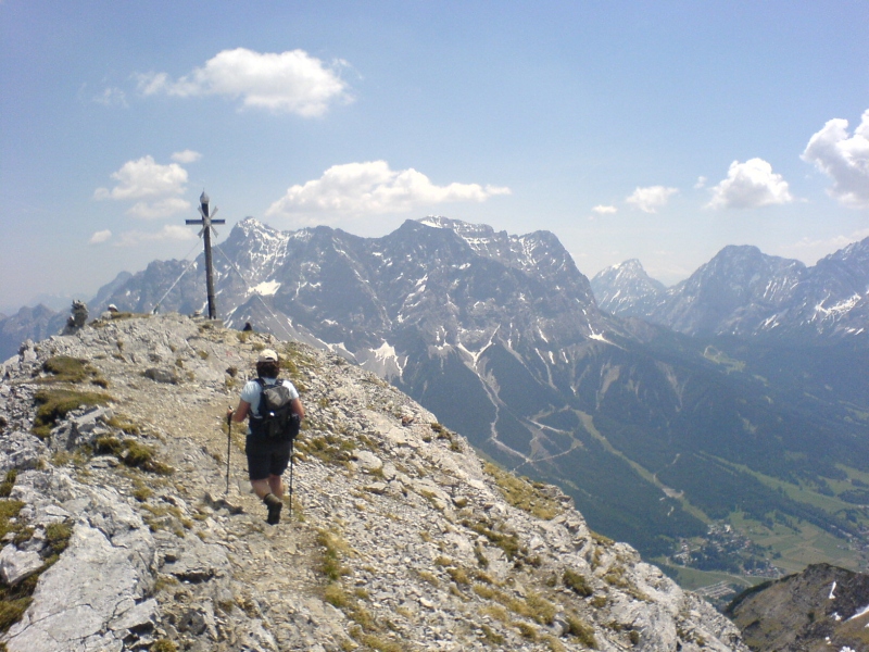 Weiter durch eine langgezogene Einsattelung am Grat entlang hinunter und im Osten wieder ansteigend zum Gipfel des Daniels (2340m), dem höchsten Gipfel der südlichen Ammergauer Alpen. Nach der aussichtsreichen Gipfelrast wieder über die Einsattelung hinüber in Richtung Upsspitze und dort wo der Grat wieder aufschwingt, nach links über Geröllfelder auf die nach Süden ausgerichtete, mit Latschen und weiter unten mit Fichten bestandene Geländekante. Auf etwa 1600 Metern Höhe über einen schönen Weidegrund und im weiteren Verlauf zurück zu der Tuftlalm. Von dort über den Aufstiegsweg zurück und hinunter zum Panorama-Bad bei Lermoos.