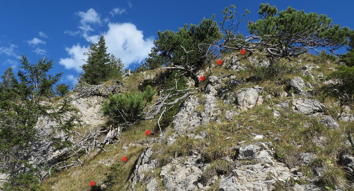 An der Kante zum Sattel hin führen einige steilere Grasrinnen hinab. Halt geben zusätzlich die zahlreichen Latschen und die Schrofentritte. Schnell ist man über die Passage hinabgeklettert (I-) und erreicht den Sattel, von welchem recht versteckt gegen Süden ein kleiner Pfad in einer Schleife durch einen Wiesenlatz hinab zieht. Aber zunächst geht es weiter gen Westen, durch Schrofen und mit kleinen Bäumen bestandenen Wiesenhängen hinauf zum sich weiter oben wieder zuschnürenden Grat, in manchen Quellen als