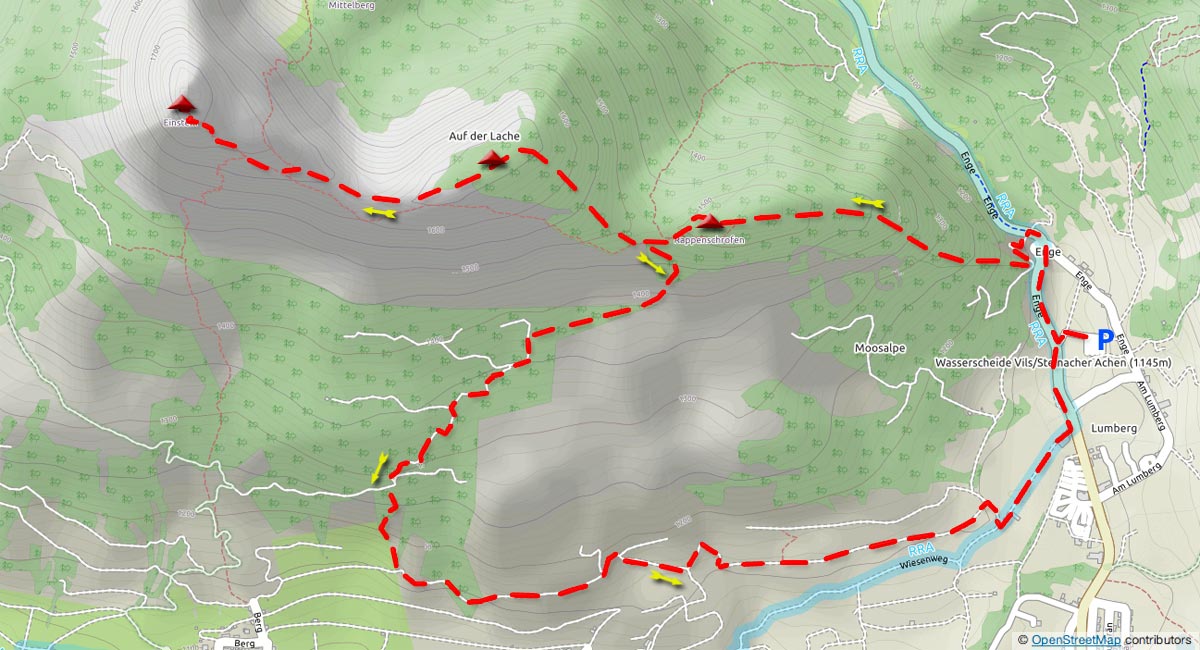 Der Retourweg folgt bis in den Sattel zwischen Rappenschrofen und dem Höhenpunkt im Gratverlauf (1.710) der Aufstiegsstrecke. Von dort dann über den weiter oben erwähnten, eher schlecht erkennbaren Pfad durch den Wiesenlatz hinab in die (offenbar einzige) Lücke zwischen den steil abfallenden Schrofenbändern. Orientierungsinn ist hier ein Muss! Ist man aber erstmal unten angelangt, leitet ein Ziehweg gemütlich gegen Südwesten hin zu einem breiten Fahrweg. Der führt zum