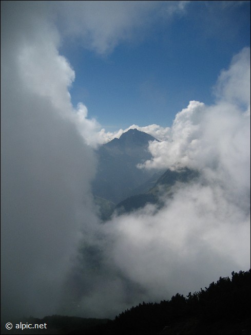 Von anderen Tourenberichten habe ich erfahren, dass es von der Ellbognerspitze ein herrliches Panorama geben würde. Ich hatte heute leider nicht das Glück, dieses genießen zu können, da ich schon seit etwa der Sattelebene im Nebel heraufgegangen bin. Sichtweiten von etwa 10 bis 15 Metern sind das Maximum, lediglich nach Norden gegen die Peischelspitze reißt einmal kurz die Wolken- bzw. Nebelbank auf und ich kann einen Blick in das Kar, westlich der Peischelspitze, werfen. Das war es dann auch schon mit den Ausblicken. In der Hoffnung auf ein Lichten des Nebels warte ich noch eine halbe Stunde und studiere die Seiten des Gipfelbuches, aber bald wird mir entschieden zu kalt und ich trete den Abstieg an.