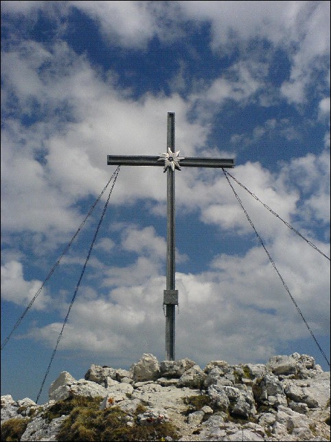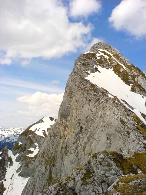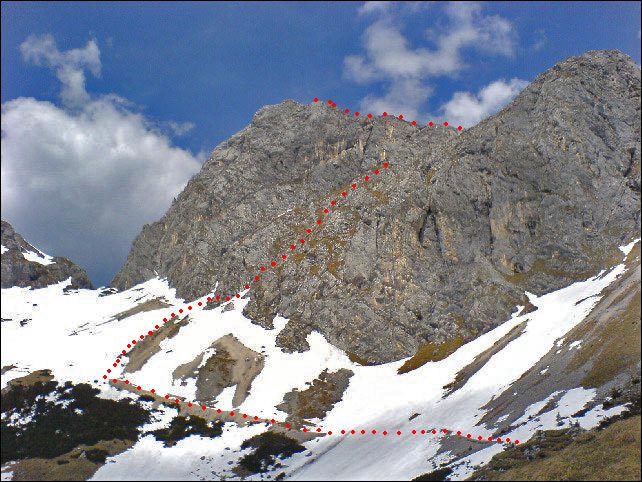 Zuerst über ein paar Schrofen (I) der kleinen Steigspur folgend, geht es dann steil zu zwei versetzt übereinanderliegenden, recht griffarmen Rinnen (II). Über schrofendurchsetztes Gelände weiter und auf Gras und Geröll hinauf auf den Ostgrat. Direkt an der Gratschneide, teilweise etwas luftig und in etwa so, als würde man über einen etwas breiteren Balken balancieren, über mehrere Felsabsätze und leichtere Kletterpassagen (I), zuletzt steiler werdend hinauf zum Gipfel.
