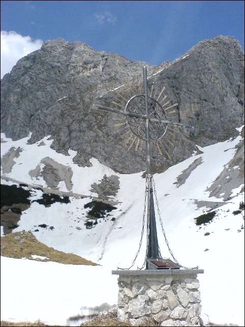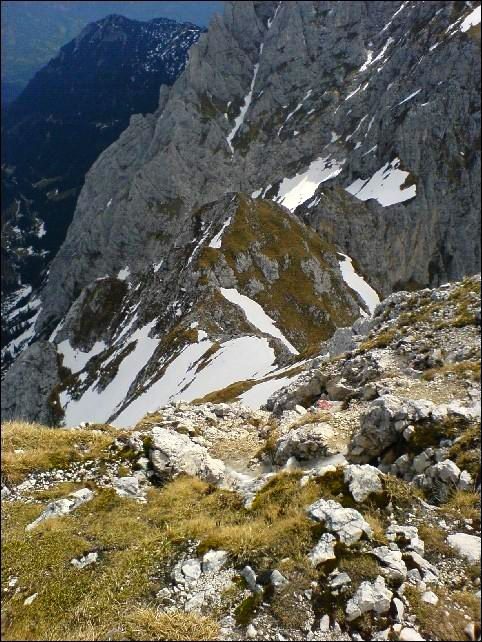 Es liegt noch Schnee in dem Kar, aber der ist schon von den zahlreichen Kletterern fest angetreten, die immer wieder in Grüppchen an den Wandfuß hinaufstapfen. Auch jetzt befinden sich gerade drei Seilschaften in der Wand und ich blicke immer wieder mal zu einer der Gruppen hinauf und verfolge ein wenig ihr Tun. Ich selbst folge der Spur im Schnee, die linkerhand immer weiter in das Hochkar hinaufzieht. Noch über eine apere Schotterrinne hinauf und ich stehe am Abzweig und Einstieg des Gimpels.