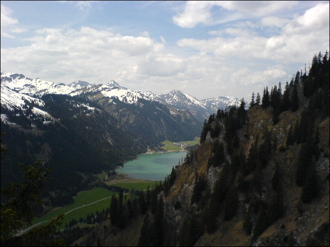 Nach kurzer Rast auf der noch leeren Terrasse am Gimpelhaus geht es dann auch schon wieder hinunter ins Tal.