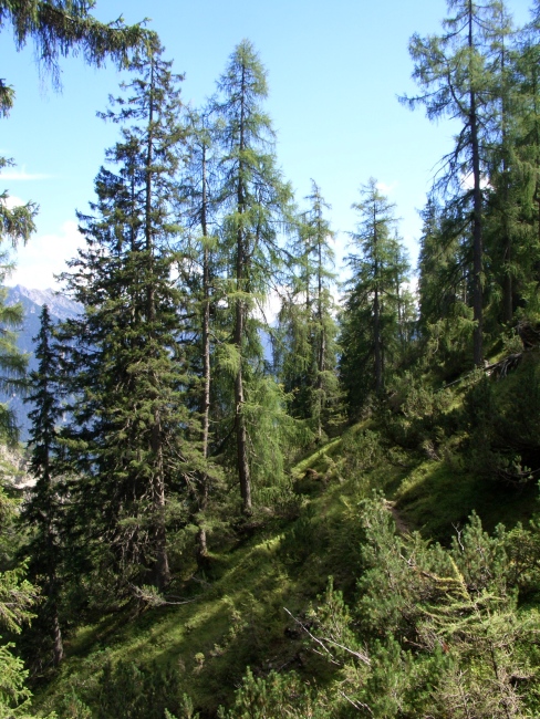 Von Vorderhornbach zunächst über einen Fahrweg (Narrenfeld lt. AV-Karte) in nordöstliche Richtung. Nach etwa fünf Minuten zweigt ein Steig nach links in den Wald hinauf ab. Bald an einer Quellfassung vorbei geht es eine Weile in mäßiger Steigung bis zum Brennboden und hinauf in Richtung Sattele. An der Wegverzweigung "Grubachspitze oder Grubachspitze über Karle" habe ich den Direktanstieg verfolgt, welcher steil über stark verwachsenes Gelände emporzieht, sich aber bald wieder zurücklegt.