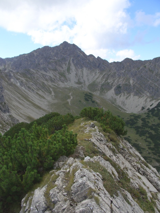 Nach der ausgiebigen Gipfelschau geht es dann zunächst über den Aufstiegsweg zurück bis zu einem größeren Stein, auf welchem drei Pfeile aufgemalt sind. Einmal der Anstieg zur Grubachspitze über den Direktweg nach bergaufwärts und abwärts und dann noch der Steig über das Karle, welchem ich jetzt folge. Von dem Geländerücken erfolgt ein kurzer Abstieg an die Flanke und parallel zu dem Rücken vorerst über einen schmalen steig hinunter. Später folgt noch ein Quergang durch die Latschen hinüber, fast bis zum Sattele, der Einsattelung zwischen der Saldeinerspitze und dem Schnatterbachkopf.